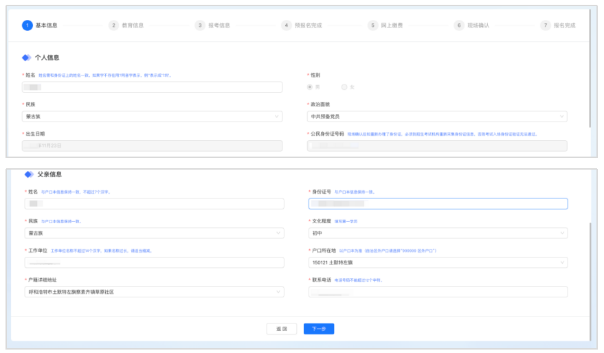 按照页面要求,依次填写“个人信息”、“母亲信息”、“父亲信息”。