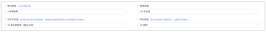 若报考类别为“艺术类”,且“艺术子科类”选择为“音乐表演类”、“音乐教育类”则需要录入曲目信息。