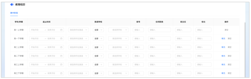 基本信息中,填报“本人户籍是否从自治区外迁入”为“是”或“是否是自治区外来务工人员随迁子女”为“是”的考生,需要录入“教育经历”信息。填报“教育经历”时系统支持快捷填充与清空操作,填充行和上一行内容保持一致,且支持修改。其中“起止时间”不进行自动填充。