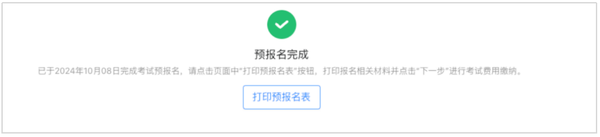 第四步完成预报名,考生须仔细核对填报信息、报考信息及考试科目信息,并点击页面中“打印预报名表”下载预报名阶段相关报名表格文件。
