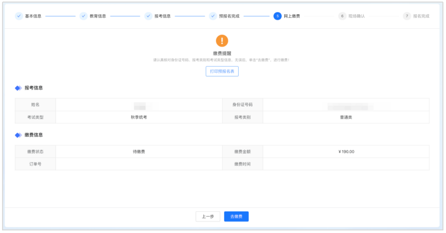第五步缴纳考试报名费用,考生须仔细核对报考信息及缴费金额信息。核对无误后点击“去缴费”按钮,