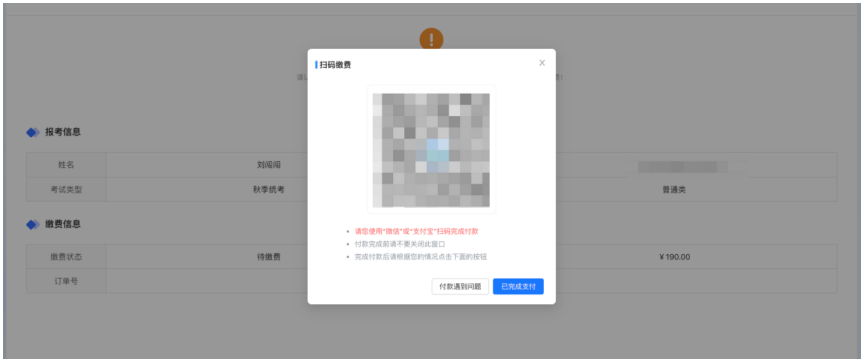 使用“微信”或者“支付宝”扫描页面弹出的缴费二维码并进行费用缴纳,缴纳完成后,点击“已完成支付”按钮。